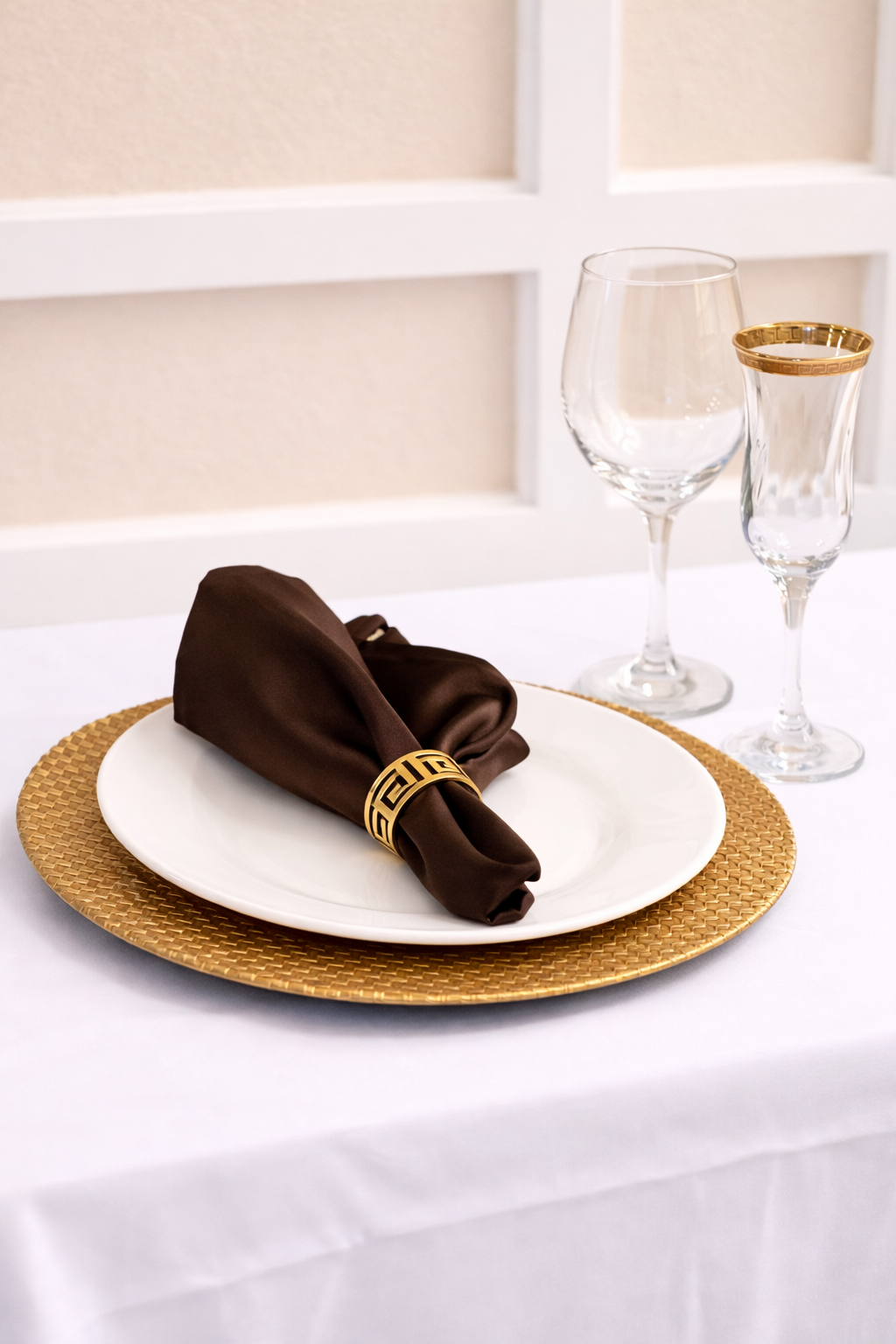 The subtle patterned border adds visual interest while keeping the center smooth and reflective, making it the perfect base for dinnerware, napkins, and formal place settings. This charger photographs beautifully under ambient lighting and pairs effortlessly with both modern and classic event designs.