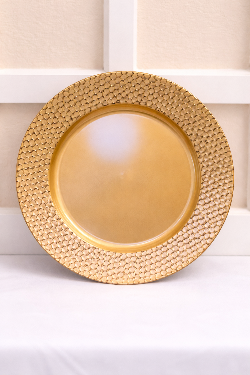 Add an elegant finishing touch to your table settings with our Gold Textured Charger Plates. Designed to elevate any tablescape, these chargers plates features a rich gold finish with a sophisticated honeycomb pattern rim, creating depth, shine, and a refined luxury aesthetic.  The unique design creates a captivating focal point, making these plates a stunning addition to your table.