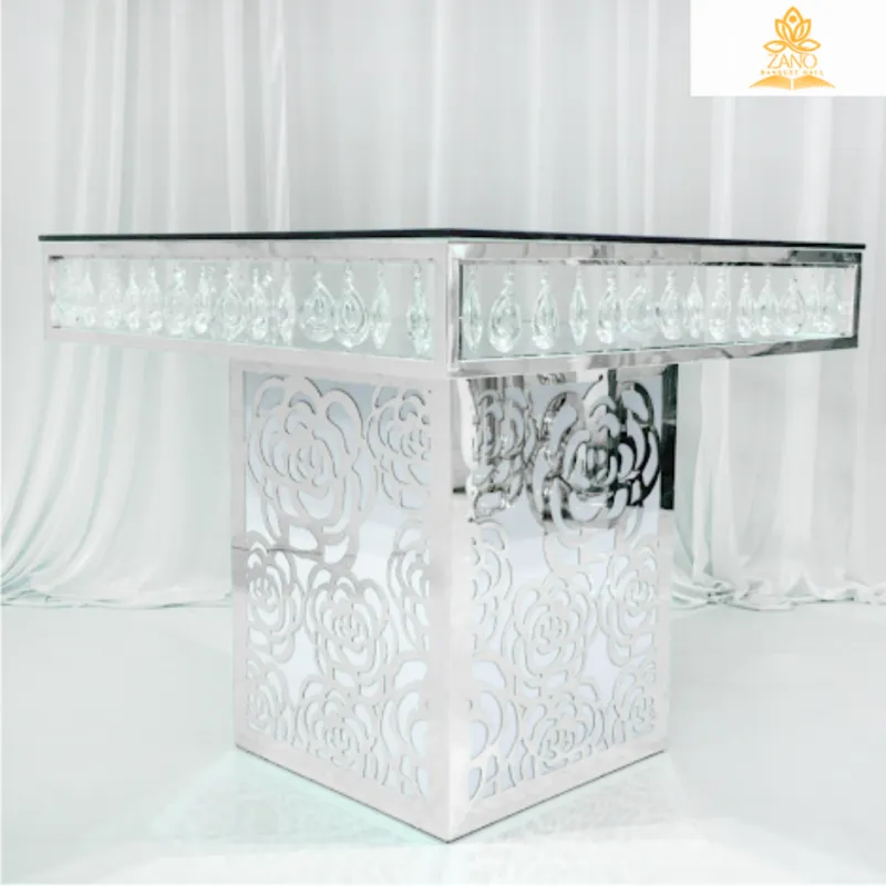 Silver Luxury Square Cake Table with Crystal & Floral Laser-Cut Design